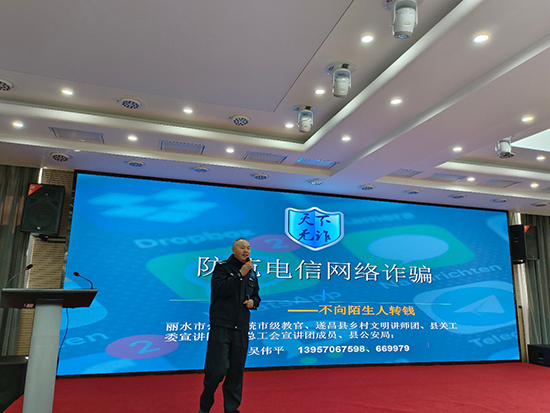 会议第二项内容开展反诈培训。遂昌县退教协和杭州银行邀请丽水市公安系统市级教官、遂昌县公安局吴伟平开展《你我同心 反诈同行》培训。吴教官围绕“防范电信网络诈骗——不向陌生人转钱”,用一个个案例、一组组数据,讲了发生在省外、省内、丽水、遂昌身边的近年来电信网络诈骗发案情况、发案形势、被骗原因及惨痛的教训。提醒大家切勿将自己的账号、密码、验证码泄露,坚决不向陌生人(或未经证实的熟人)转钱转账!