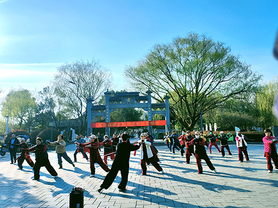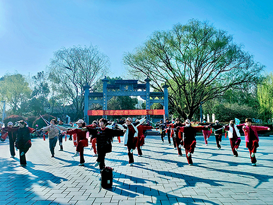 孝子公园绿意盎然的环境为课程增添独特意趣。在晨光中舞剑,剑光与树影交错,构成一幅动静相宜的养生画卷。薛建萍介绍,户外教学能让学员更好地感受“天人合一”的太极理念,公园的开阔空间也利于动作舒展。课程还融入中医经络知识,讲解太极剑对肩颈、腰腿的保健作用,激发学员长期坚持的动力。