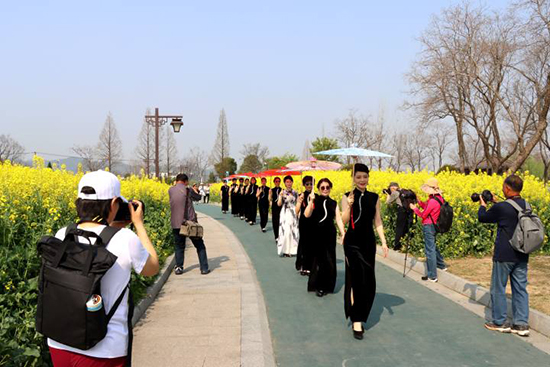 只见形体走秀班的学员们身着旗袍,在花海间迈着优雅的步伐。她们身姿婀娜,一颦一笑、举手投足间尽显自信风采,与烂漫春光相互交融,构成了一道道亮丽的风景线。摄影班学员们则穿梭其中,全神贯注地用手中相机定格美好瞬间。为了让摄影班学员们有更多的拍摄素材与独特视角,授课教师陈定根更是别出心裁,将自己的乌篷船划到河边。在悠悠的乌篷船上,陈老师一边亲身示范,一边为学员们讲解如何拍摄水乡特色与人物景致融合的照片,让学员们近距离领略“小桥流水人家”的江南韵味。
