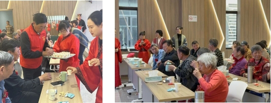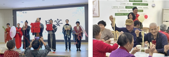 活动尾声,长者们围坐品尝社区志愿者手工制作的长寿面,现场特别设置的“春日汉风打卡点”前,老人们纷纷驻足拍照留念。社工小孔表示:“我们希望通过这种‘学习+体验'的模式,让传统文化融入长者生活,让他们在活动中收获知识,感受到社区的温暖陪伴。”