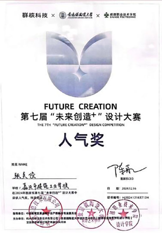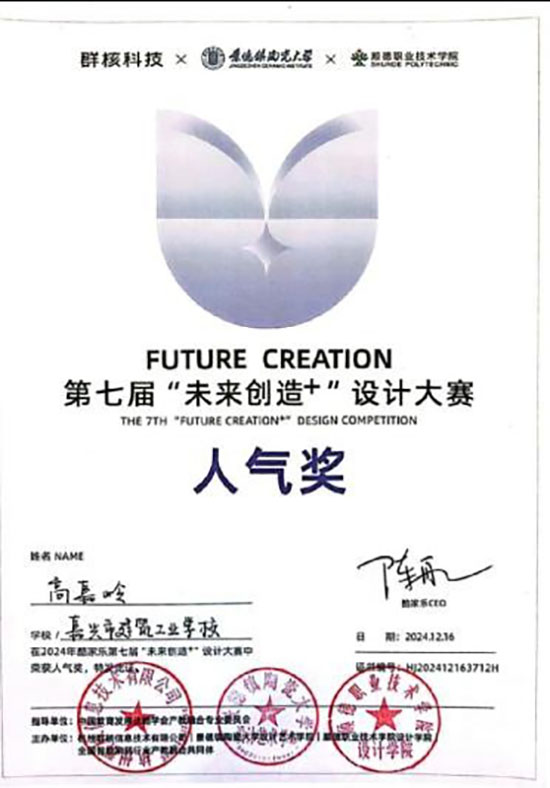 VR室内设计体验馆和装饰施工虚拟仿真实训室是建筑装饰技术专业比赛的“备战营”,也助力一批优秀学生在各类大赛上崭露头角。曾获“未来设计师大赛”全国前五强、“未来创造+”大赛全国三十强和最佳人气奖等。这里还是专业技能考证的孵化器,学生们将理论知识应用于数字化装修技能,参加“1+X”学生技能等级证书,为他们的职业发展之路奠定坚实基础。