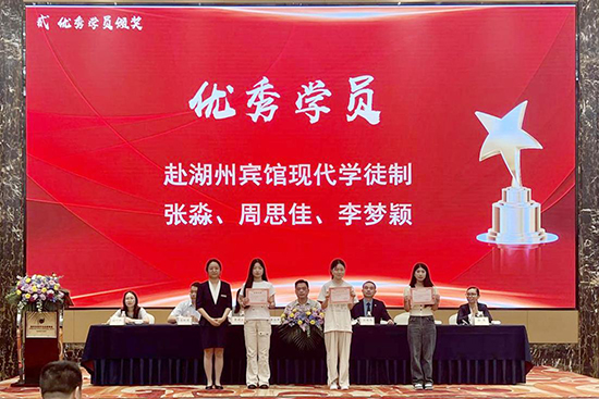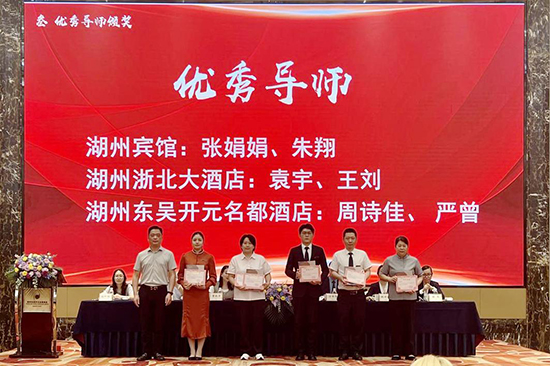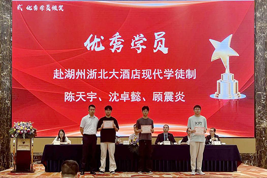 湖州宾馆、浙北大酒店、湖州东吴开元名都酒店领导为十位优秀学员颁发荣誉证书。费永军副校长为6位优秀企业导师颁发荣誉证书;优秀学员代表2219班汪义超同学作学徒分享;学校综合专业部副部长孙叶玲,就本次现代学徒制的教学实施与考核评估作专业总结。
