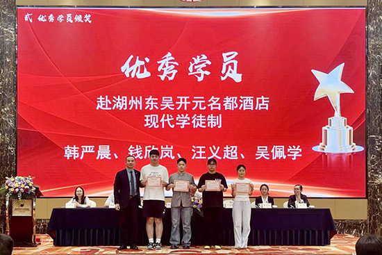 6月23日下午,浙江省湖州艺术与设计学校2025年旅游服务与管理专业现代学徒制总结与表彰大会在湖州东吴开元名都酒店举行。此次大会旨在总结现代学徒制项目成果,表彰优秀学员和带教师傅,进一步深化校企合作,共育高素质技能人才。