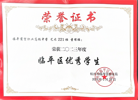 童璟瑶,杭州市临平商贸职业高级中学2022级艺术设计与制作专业学生。她成绩优异,学业成绩和专业成绩全年级第一。2023学年荣获临平区高中学生假日杯学科学科素养提升活动数学c组二等奖;2022年临平区假日杯作文竞赛一等奖;2023年校技能节英语演讲三等奖;2023年度临平区优秀学生;2022学年获得校“青荷标兵”荣誉称号;2024年度杭州市优秀学生。