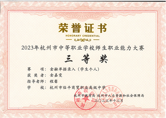 【数字精灵】当晨曦刚刚吻上临平商贸职高金融实训室的键盘,金嘉雯的指尖已开始在数字键区跳起芭蕾。这个与会计凭证一见钟情的女孩,把枯燥的数字练习谱写成诗——每一次敲击都是平仄,每张票据都是待填的韵脚。在同学们追逐偶像剧的年纪,她的偶像却是五笔字根表,那些横竖撇捺的密码,最终被她破译成区赛二等奖的密函。