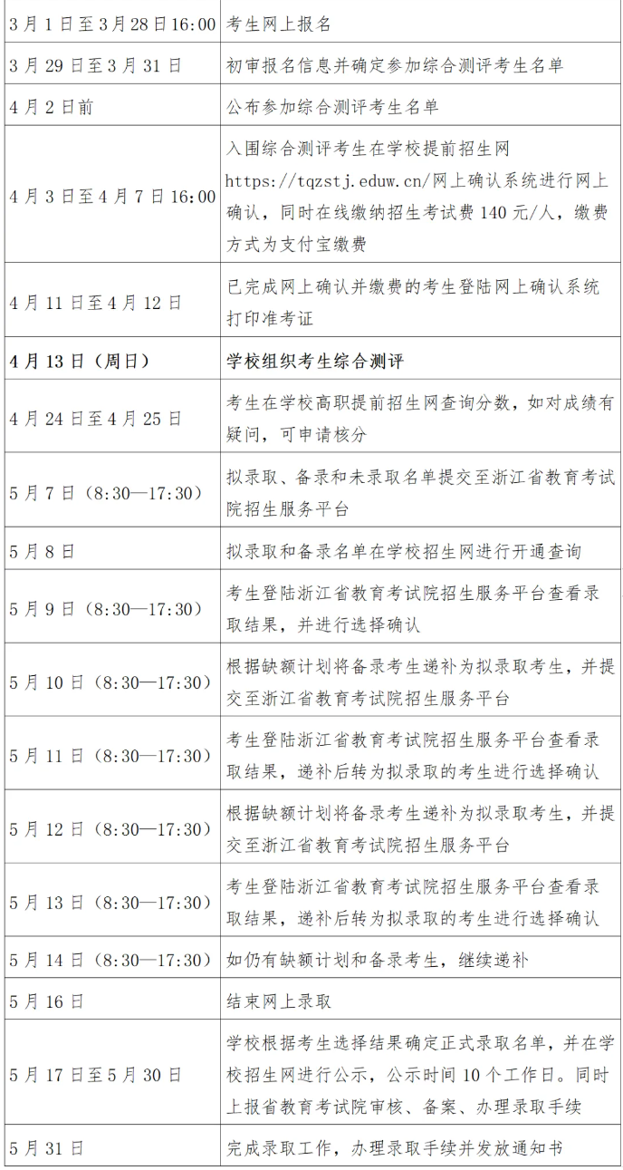 凡符合我校高职提前招生报名条件的考生于3月1日-3月28日16:00通过学校提前招生网(https://tqzstj.eduw.cn/)登录,或直接登录浙江省教育考试院高职提前招生服务平台提交报名信息。
