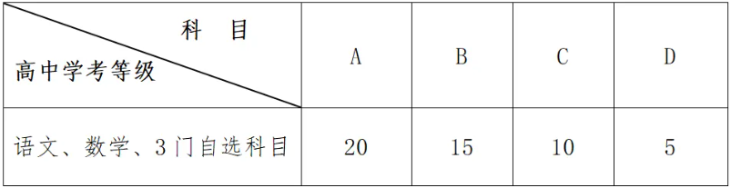普高招生考生普通高中学业水平考试(学考)折算成绩由2门必选科目+3门自选科目组成,五门科目成绩进行折算,不同等级换算成相应分值,满分为100分。必选科目为语文、数学,三门自选科目从外语、物理、技术、政治、历史、地理、化学、生物中选择学考等级最优的三门。高中学考等级以浙江省教育考试院提供的成绩为准,学考等级是外省获得的,须提供学籍所在省的省级机构出具或签署意见的学业水平考试成绩证书或证明(原件)。换算如下表: