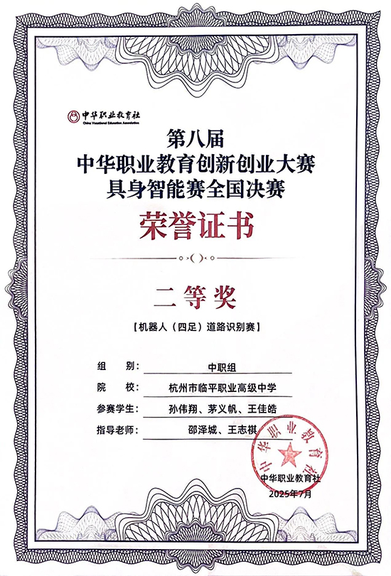 为发展新质生产力,推动具身智能领域的人才培养,第八届中华职业教育创新创业大赛增设“具身智能赛道”。杭州市临平职业高级中学创新创业教研组从四月的全国培训会开始,积极备战。创新创业教研组组织师生积极训练,经过前期备赛、全国选拔赛,最终在全国总决赛中获得佳绩,五支队伍全部获奖,共取得 一等奖1项,二等奖3项,三等奖1项 。