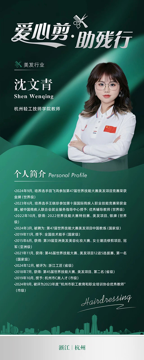 拱墅区“爱心剪·助残行”公益活动现场,杭州轻工技师学院教师沈文青俯身与轮椅上的王阿姨轻声交流,手中剪刀精准落下。这位曾站上世界技能大赛领奖台的95后姑娘,此刻正将她的顶尖技艺化作助残暖流。