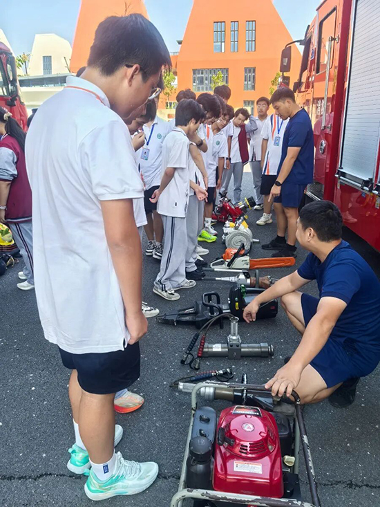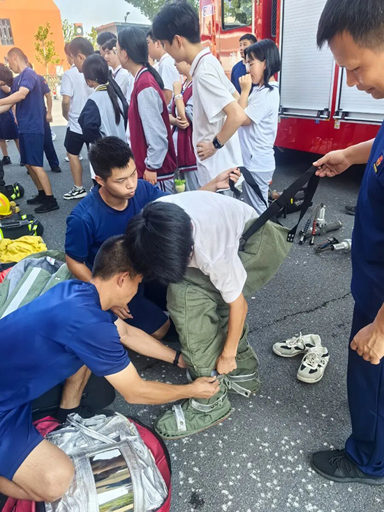 演练结束后,埭溪镇消防综合应急救援队组织各班安全委员开展了培训与互动交流。救援队队长陈根生首先对本次逃生演练过程进行了总结点评,随后系统讲解了火灾的常见成因、校园内典型的火灾隐患、火灾初期的报警流程以及疏散逃生中的注意事项。之后,在救援队队员的带领下,学生们近距离参观消防车,并亲身体验了消防装备的使用,通过消防员的细致讲解,同学们对消防设备有了更直观地认识。