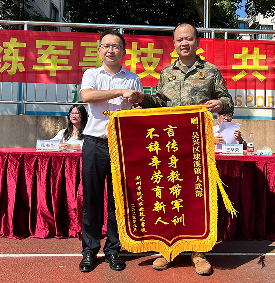 教官用最严厉的教导磨砺了学生的意志,用最悉心的关怀,给学生坚持的动力。汤方荣赠与人武部锦旗。