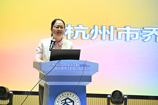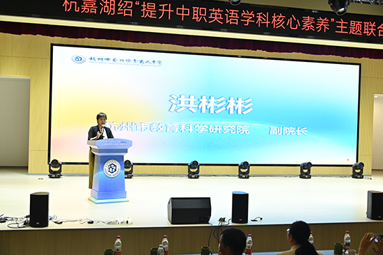 杭州市教育科学研究院副院长洪彬彬首先致辞,她指出,在“人工智能+”与“职普融通”的新背景下,教师要持续学习,吸取国内外先进教学理念,借鉴各级各类教学同行的有效教学模式,特别是要深度研究实施教育戏剧,高效促成英语学科核心素养落地。