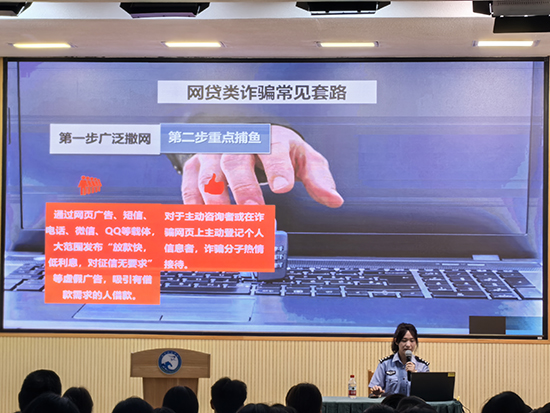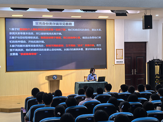 随后,费警官详细介绍了当前高发的诈骗类型,包括网络贷款诈骗、兼职刷单类诈骗、网络消费类诈骗、冒充身份类诈骗以及游戏类诈骗等。她结合近期发生的典型案例,揭示了诈骗分子的惯用伎俩和心理战术,让同学们对诈骗的隐蔽性和危害性有了更直观的认识。