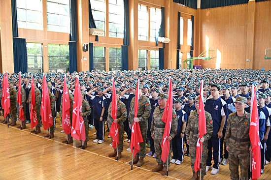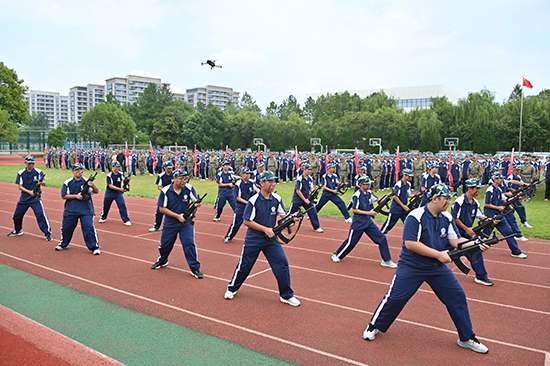 杭州市临平区乔司街道人武部承担本次军训指导,在开营仪式上,学校领导向军训团授旗,副校长喻新凯作动员讲话,他希望同学们端正态度,顽强拼搏;团结协作,互帮互助;遵守纪律,服从指挥,圆满完成军训任务。