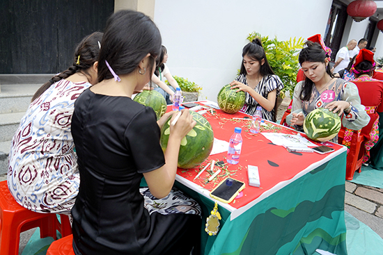 身着维吾尔族传统服饰的学子们,很快成了街区里最先“点亮”视线的风景:他们全情投入雕刻,指尖的刻刀在翠绿瓜皮上灵活游走:时而轻划勾勒江南纹样的柔婉线条,时而凝神精雕细节处的精巧弧度,吸引了大批游客驻足。