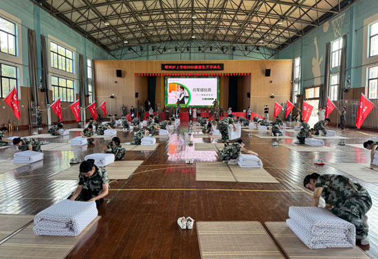 为丰富绍兴护士学校新生军训期间文化生活,提升学生执行力、内务整理水平,引领学生树立正确劳动观,近日,绍兴护士学校在体艺馆举行了2025级新生叠被子比赛。