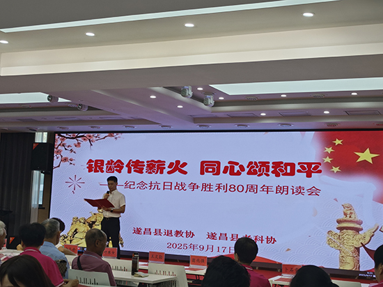 为“纪念中国人民抗日战争暨世界反法西斯战争胜利80周年”,9月17日,遂昌县退教协在县教师发展中心5楼多功能室举办以“银龄传薪火,同心颂和平”为主题的朗读活动。遂昌县教育局副局长江振军到场致辞,遂昌县老体协主席尹根松、遂昌县科协等相关领导、退教职工150余人参加。