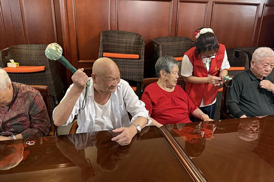 不到一个小时,老人们陆续完成了自己的作品。他们迫不及待地拿起亲手制作的艾草锤,轻轻敲打着肩膀和手臂,相互展示、比较,活动室瞬间变成了一个热闹的“理疗现场”。爷爷奶奶们说:“闻着这个艾草味,感觉浑身都舒坦了。关键是孩子们有这份心,陪我们聊天、做手工,比什么都开心。”
