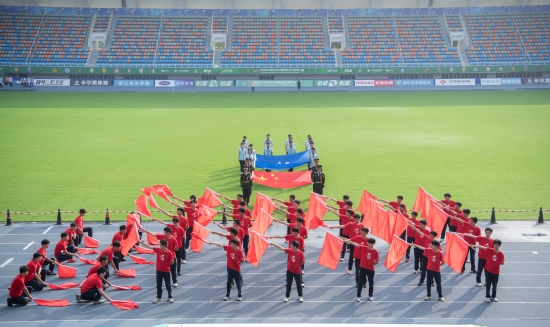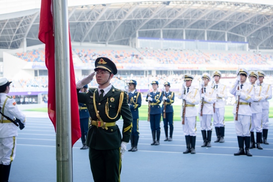入场完毕后,全场肃立,升国旗,奏唱国歌,表达对祖国的崇高敬意!