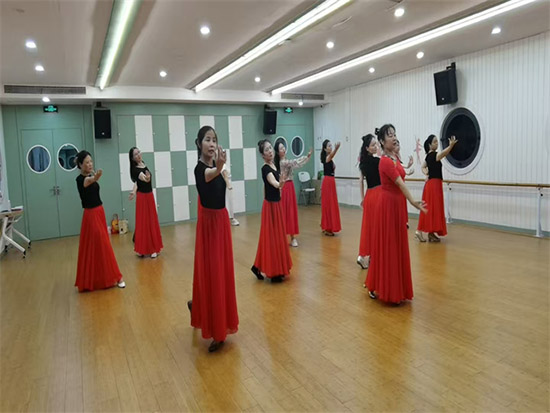 这些学员来自安吉县的各个村镇与社区,年龄或许有差异,舞蹈基础也不尽相同,但此刻眼中都闪烁着同样的专注与热忱。镜子前,潘虹老师正逐一把关动作细节:抬手时的弧度要再柔和些,转身时的重心需再稳一点,连眼神望向远方的角度,她都俯身细细指导,生怕错过任何一处能让舞蹈更显深情的细节。“大家跟着音乐再走一遍,注意跟上节奏,把对祖国的感情融进去。”潘老师的声音温和却有力量,学员们闻言调整呼吸,再次起舞时,动作间多了几分默契,也多了几分对旋律的共情。