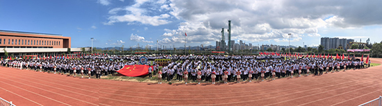 庄严的升国旗仪式,全场师生肃立,向国旗行注目礼。