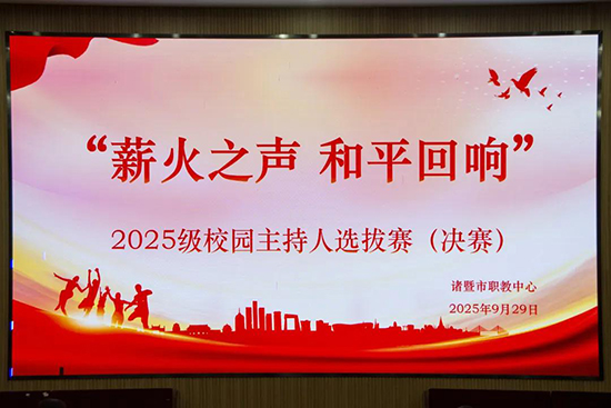 近日,诸暨市职业教育中心2025级“薪火之声 和平回响”校园主持人大赛决赛在校多功能厅圆满举行。经过初赛选拔脱颖而出的10位选手在决赛中同台竞技,最终,25长征1班楼亿、25工美班兰紫怡两位同学凭借出色表现荣获一等奖。
