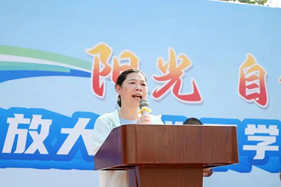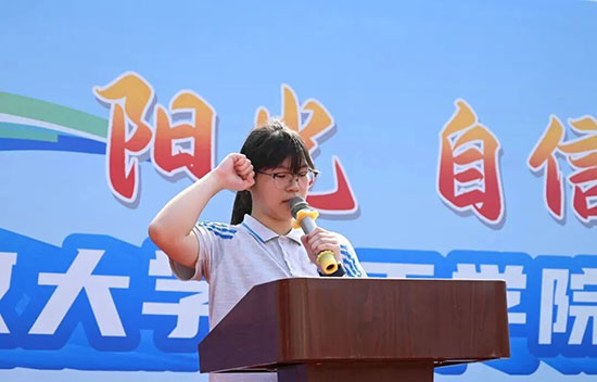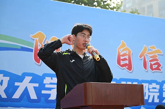 院长沈美华致开幕词。沈院长代表学院向所有为运动会的召开精心准备、积极参与的各位老师和同学表示感谢。校运会的举办是对学院体育工作、师生体育素质和精神风貌的一次检阅,更是各参赛班级竞争意识、团队精神的综合体现。希望同学们在本次校运会中奋勇争先、勇攀高峰,赛出风格、赛出友谊、赛出水平,展示出无限活力和青春风采。