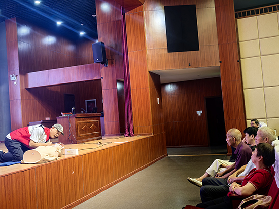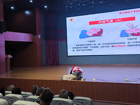 培训现场,来自浙江省红十字会一级应急救护师丁柏伟讲师结合日常生活中可能遇到的突发状况,深入浅出地讲解了掌握应急救护知识的重要性。丁讲师重点围绕心肺复苏术(CPR)进行了系统教学,内容涵盖如何快速判断患者意识和呼吸状态、如何正确进行呼救、胸外按压的关键步骤(包括按压部位、深度、频率和力度的精准把握)、开放气道的方法以及实施人工呼吸的有效技巧。讲解过程中,讲师通过生动的案例剖析,强调了“黄金四分钟”对于挽救心脏骤停患者生命的决定性意义。