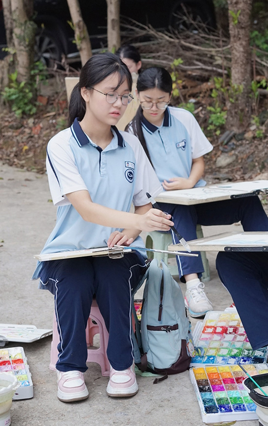 色彩老师黄舒曼说,户外写生最能锻炼学生的观察力和表现力,要学会捕捉转瞬即逝的光色变化,这是艺术成长的重要一课。比如让同学们观察山林的绿叶在夏末的强光下和初秋的质感是不同的,希望同学们通过写生,能够理解季节转换中色彩的微妙变化。