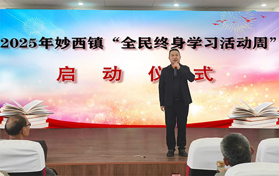 湖州市妙西镇成人文化技术学校校长朱春明作动员讲话。他指出,终身学习是赋能乡村振兴的重要支点,是迈向共同富裕的精神航道;期盼家家户户“开卷有益”,让书香与烟火气相融相伴,让“学在妙西”成为最鲜亮的共富底色。