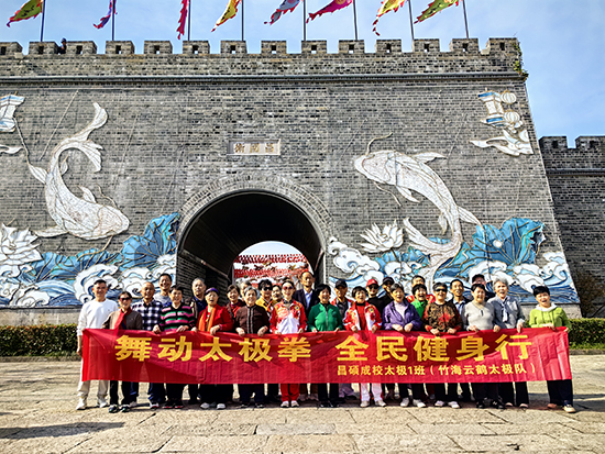 活动第一站,学员们来到了昌国卫古城。古城门墙绘着灵动的锦鲤与莲花,古风建筑与文化元素交融,尽显历史韵味。学员们在古城门前再次集结,鲜艳的“舞动太极拳 全民健身行”横幅与古朴的城门形成鲜明对比,既展现了太极文化的传统底蕴,又彰显了当代中老年人积极向上的生活态度。