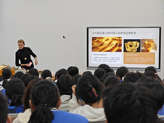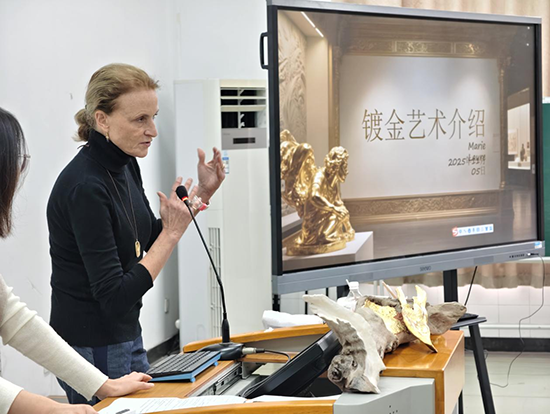 课程伊始,玛丽老师通过精美的PPT为同学们讲解了镀金艺术的历史。这一技艺最早可追溯至公元前2300年左右的古埃及,随后在古代中国、古腓尼基、拜占庭等文明中均有应用。当一幅幅展现中国古代镀金工艺精品的图片呈现于眼前时,同学们不禁发出由衷的赞叹。