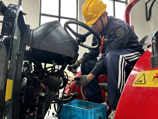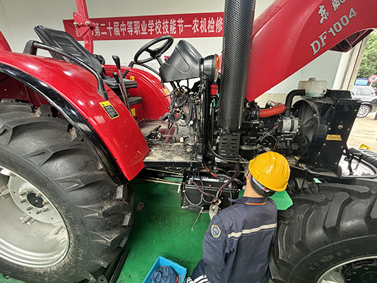 在收割机检修项目中,60分钟内他们需完成自走履带式谷物联合收割机的技术维护、故障诊断与排除及零件鉴定检修等工作。针对收割机动力传动、转向、制动等系统,他们细致检测、快速响应,将专业知识转化为高效的实操能力,顺利完成各项检修任务。