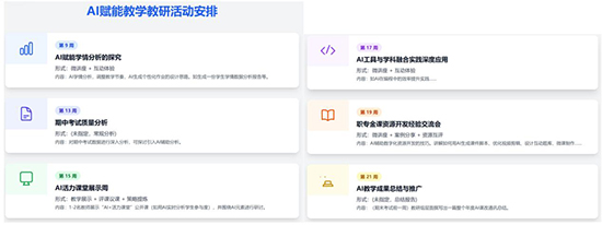 围绕 “AI 与个性化教学”“AI 辅助评价” 等核心教学主题,制定阶段性教研计划。第 9 周开展 AI 赋能学情分析探究,指导教师用 AI 生成学情报告、设计个性化作业;第 15 周举办 “AI 活力课堂展示周”,通过公开课展示 AI 实时分析学生参与度等创新应用;第 19 周开展金课资源开发交流,分享 AI 生成课件脚本、优化视频剪辑等实用技巧,让 AI 精准对接教学实际需求。