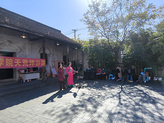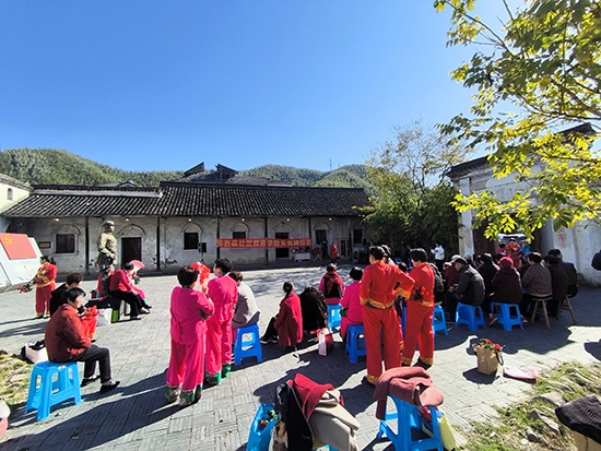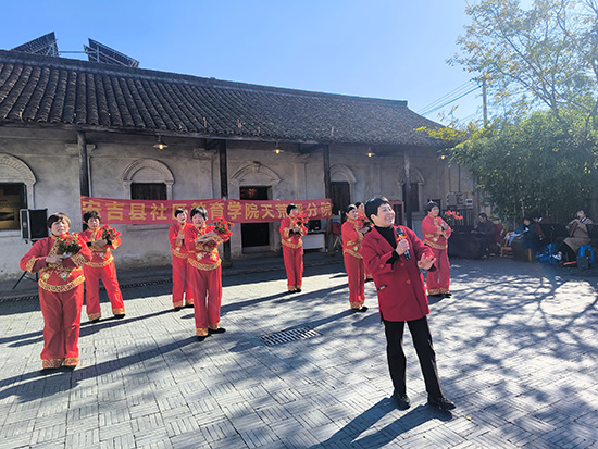 11月19日,天荒坪镇马吉村粟裕纪念馆门前操场化作红色文化舞台。安吉社区教育学院天荒坪分院(天荒坪成校)老年歌咏班全体学员自发组织学期成果展演,以“红歌+舞蹈”形式献上20个节目。天荒坪成校校长汪华忠、马吉村村委领导全程观摩,村妇女主任陈凌飞担任主持,吸引百余名村民驻足。