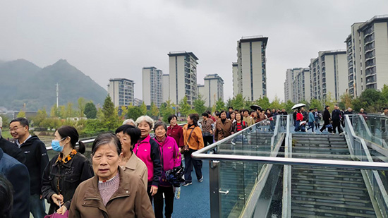 银龄教师精神抖擞地健步向前,浩浩荡荡的健步行大军如同一条蜿蜒的长龙,在仙县遂昌的凯恩路——园丁路骑行绿道——观澜府——钢架景观桥——青邻里上行进。