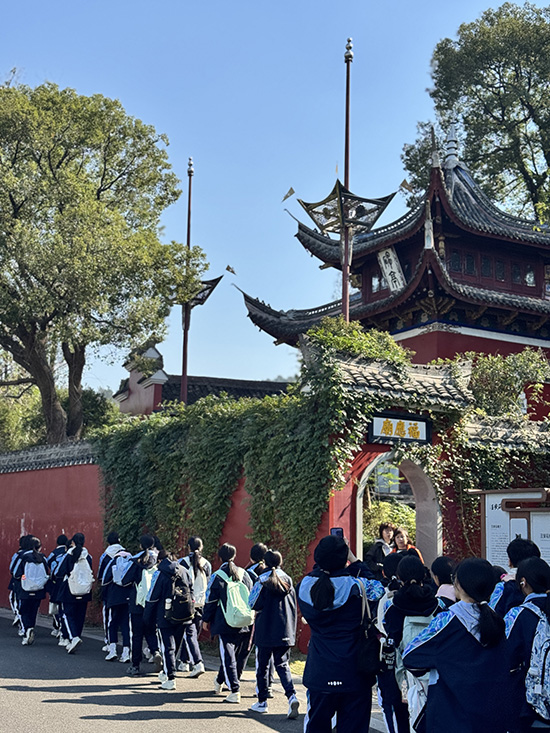 学生们列队行至湖滨码头,秋日阳光洒落在南宋水利工匠凿刻的石缝间,仿佛再现当年挥汗修堰的场景;师生沿湖探访钱湖秘境,远眺王安石曾踏访的二灵寺,途经百姓为感念其治水功绩而建的福应庙,步步追寻先贤足迹。