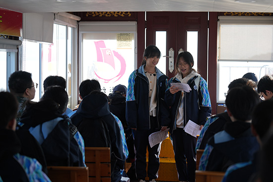 从湖滨码头乘船前往水上观音码头,小导游们上岗讲解,为同学们讲解东钱湖的整体概况及陶公岛、利民村等五个景点。从登船前的安全提示,到航程中的生动解说,再到靠岸后的整队清点,每一个环节都由学生独立完成。