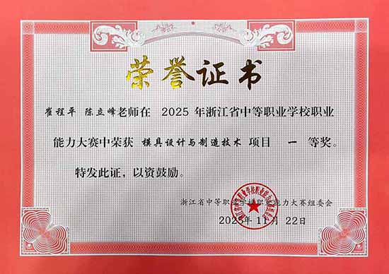 作为由浙江省教育厅主办的省级权威赛事,不仅全面考评教师的专业技能功底、教学创新能力及团队协作水平,也考查了选手们对行业前沿的把控力。此次“模具设计与制造技术”赛项聚焦复杂零件三维建模、模具结构创新设计、数控编程与精密加工全流程,对参赛团队的综合素养提出了极高要求。该校青年教师崔程平、陈立峰组成的参赛团队,凭借过硬实力与默契协作脱颖而出,最终以总分第一的优异成绩斩获该赛项一等奖,为学校赢得了荣誉!