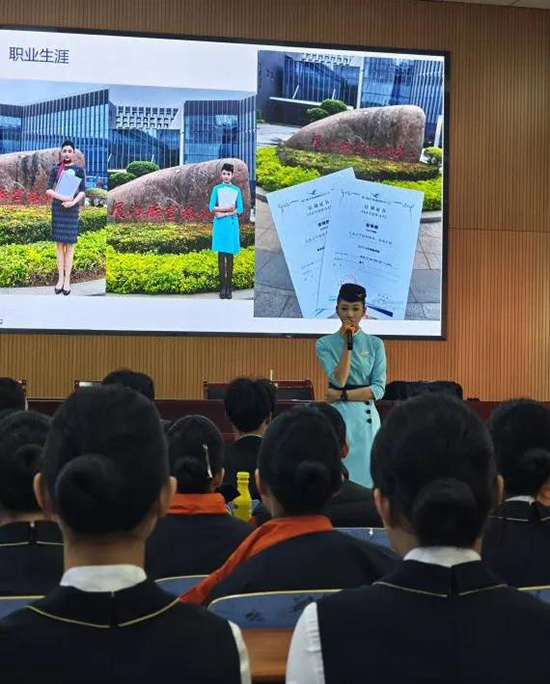 徐雨桐结合自己从校园到职场的成长历程,用生动鲜活的案例分享了职业发展中的关键节点。她从航空服务礼仪规范、客舱应急处置技巧、职业心态培养等核心内容入手,详细拆解了空乘岗位的能力要求,强调“让乘客满意的服务是我们最基本的,而让乘客感动的服务是我们追求的”。针对同学们关心的面试技巧、岗前培训重点等问题,学姐毫无保留地分享了自己的实战经验,总结出“简历突出实践经历、面试展现真诚态度、技能夯实专业基础”的求职干货,让在场学生受益匪浅。