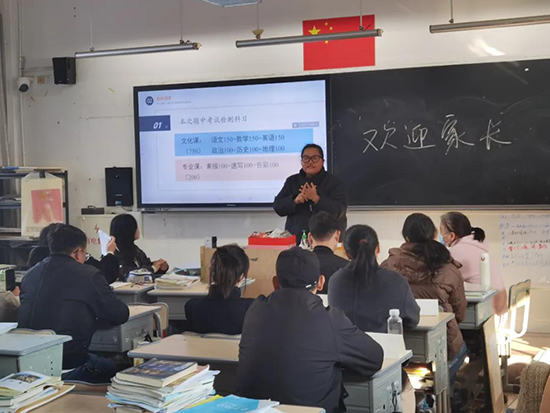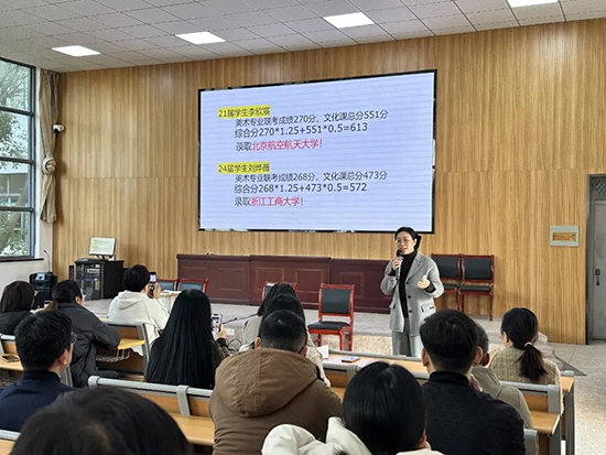 在美术高考班的集中会议上,基础专业部部长裘艳精准阐述了班级的定位,系统梳理了学生在文化课与专业课双向发展中的独特优势,并进一步明确科学清晰的学业发展路径。