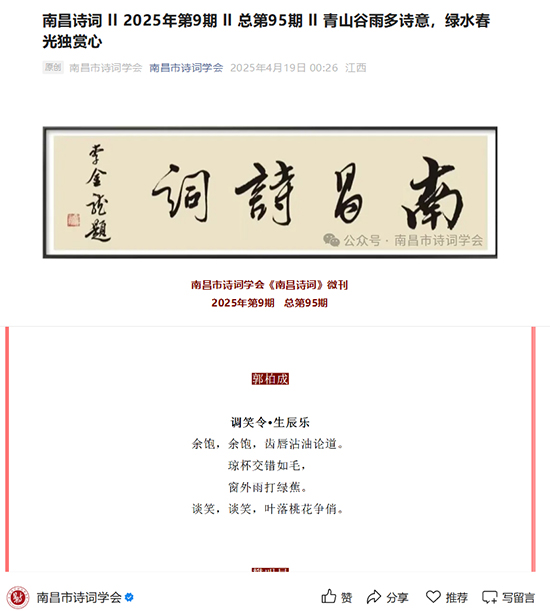 2025年,作品持续亮相于《南昌诗词》、《洪都诗词》等刊物,并凭借《长相思·百名诗人采风洞头峡特大桥》再次登上《百岛》;
