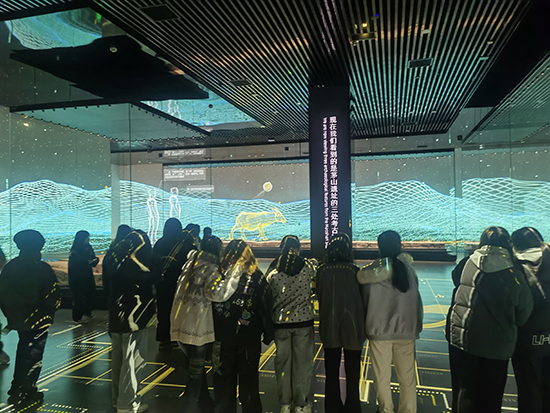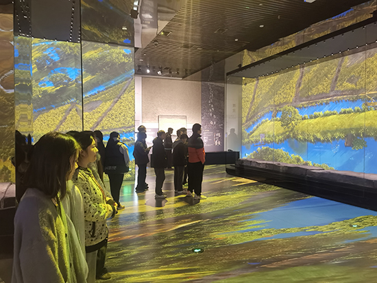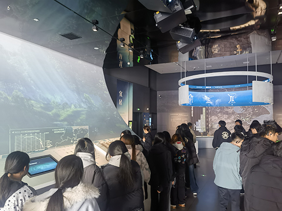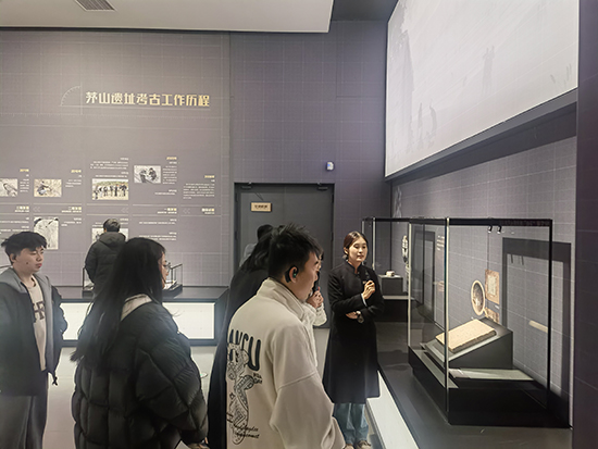 随后,队伍移步至“茅山遗址展厅”。该展厅集中展示了与良渚文化密切相关的珍贵遗存。面对一件件古朴精美的陶器、玉器,同学们驻足细观,认真聆听先民们的生产方式、社会组织与精神信仰,仿佛跨越千年,与古老文明展开了一场无声却深情的交流。
