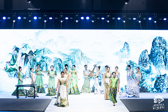 节目以“水墨”与“青绿”两大中国传统色系为基调,将古典服饰、音乐与仪态巧妙融合,讲述了一个极具东方神韵的故事。 演出始于“犹抱琵琶半遮面”的古典悬念。随后,手持宫灯、身着青绿旗袍的演员款步而出,温婉点亮江南夜色;一旁,抚琴奏乐、穿着水墨礼服的演员琴声淙淙,勾勒出山水意境。在悠扬古韵中,演员们翩然登场。其妆容头饰尤为精巧,设计师将毛笔、扇柄等元素化为头饰,与主题紧密呼应,尽显文化巧思 。