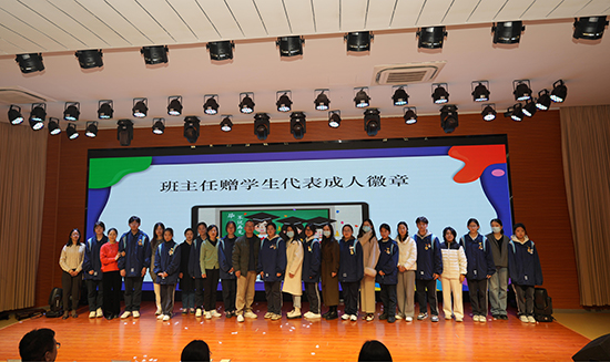 高三各班班主任为学生代表佩戴成人徽章的环节,更是将仪式感拉满。这枚象征 “自尊自治、立志成才” 的徽章,不仅是身份的转变,更是责任的传承,合影留念的瞬间,定格了师生间最珍贵的情谊。