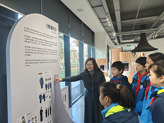 在上城区文化特派员张西琴的介绍下,孩子们的好奇心被彻底点燃。在《老鼠嫁女》展区,大家围着手稿追问苗族刺绣的寓意;看到《琵琶行》的服饰配色变化,有同学主动分享自己对诗句的理解。张西琴为孩子们搭建起通往专业艺术领域的桥梁,她结合展品细致拆解设计背后的文化内涵与创作逻辑,让孩子们读懂蒙古族图腾、唐代服饰形制如何与剧情深度融合,明白AI技术如何为传统纹样数字再生赋能。
