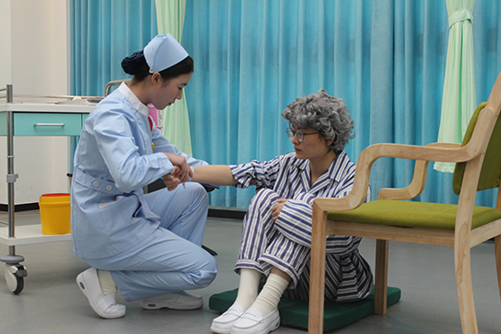 第二赛道里,选手们快速判断老年患者伤势,包扎绷带松紧适度,轮椅运送时细心调坐姿、系安全带,轻声安慰让“患者”倍感安心。