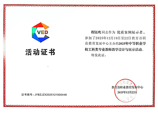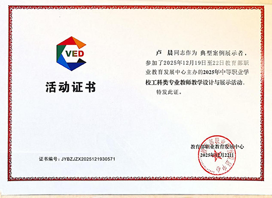 2025年12月20日,由中国教育部职业教育发展中心主办、高等教育出版社等单位承办的“2025年中等职业学校工科类专业教师教学设计与展示活动”在福州圆满落幕。经过激烈角逐,临海市中等职业技术学校教师卢晨老师凭借其卓越的教学设计作品《东风风光580 曲轴位置传感器的检测与更换》,从全国近130位交通类学科参赛教师中脱颖而出,荣获“典型案例展示”奖项(一等奖);程钰鹰凭凭着匠心之作《一笔绘鸱吻,一纸承古建:古建鸱吻复原图的绘制》荣获“建筑优质案例展示”奖项(二等奖)。