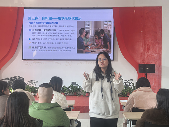 讲座中,吴晶围绕“建关系、谈利弊、立规则、常复盘、育新趣”五步方案展开分享,强调所有实施步骤均需以良好的亲子关系为根基。她建议家长多欣赏、少批判,用真诚的赞赏为“家庭情感银行账户”积极“存钱”;与孩子共同制定手机使用契约,以积极鼓励的方式推动孩子实现自主管理;主动创造无手机的家庭互动环境,用运动、桌游、亲子协作等真实可感的快乐,替代孩子在虚拟世界中获取的短暂满足。