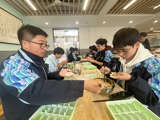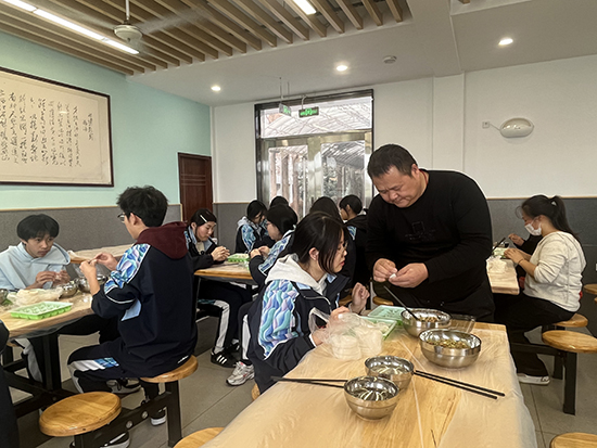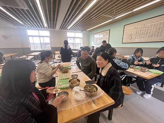 活动当天,食堂一改往日“单向供餐”的模样,摇身变成温馨的“家庭厨房”。有的家长手法娴熟,擀出的饺子皮薄如纸、圆如月。有的学生第一次包饺子,虽然包得歪歪扭扭,却满脸自豪。老师们也不甘示弱,一边包一边打趣:“这褶子捏得,比我写教案还认真!”